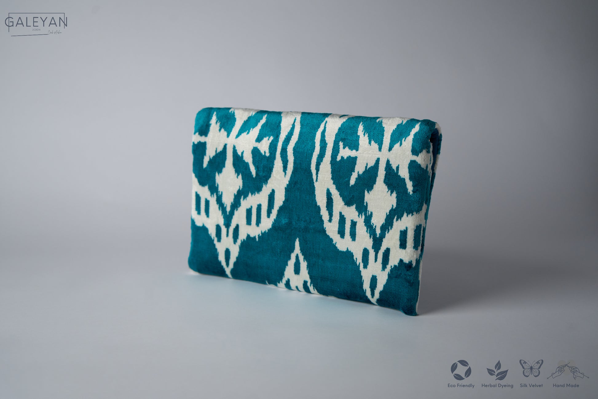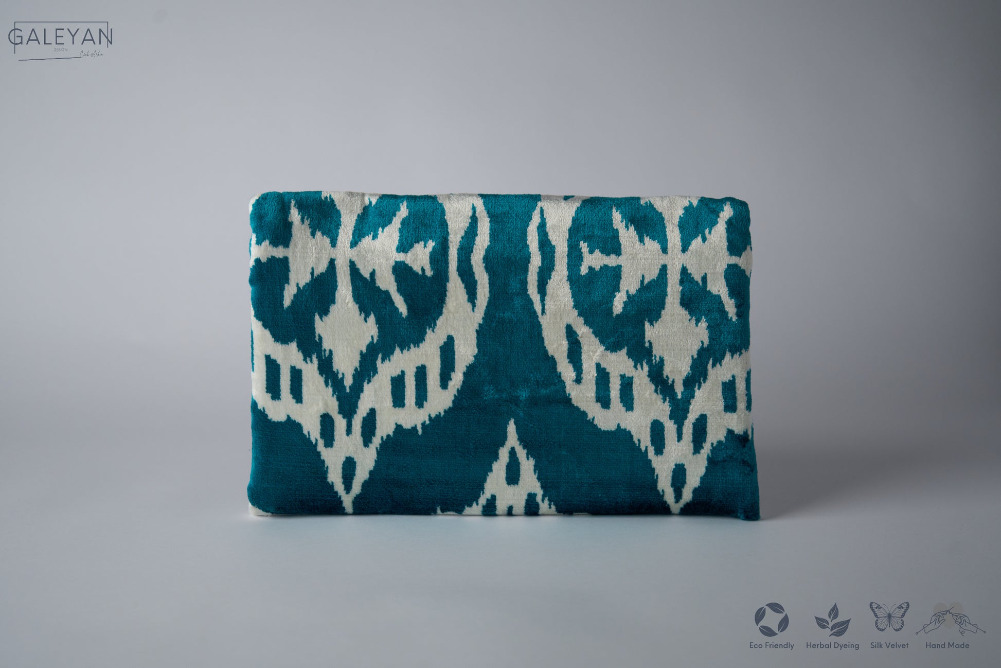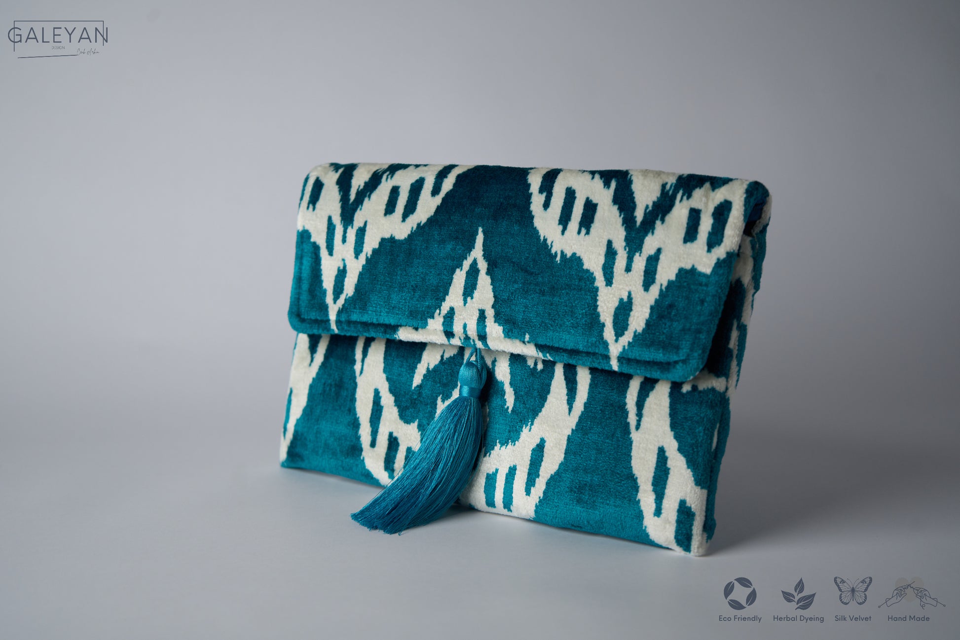 Silk Velvet Ikat Clutch – Off White / Turquoise