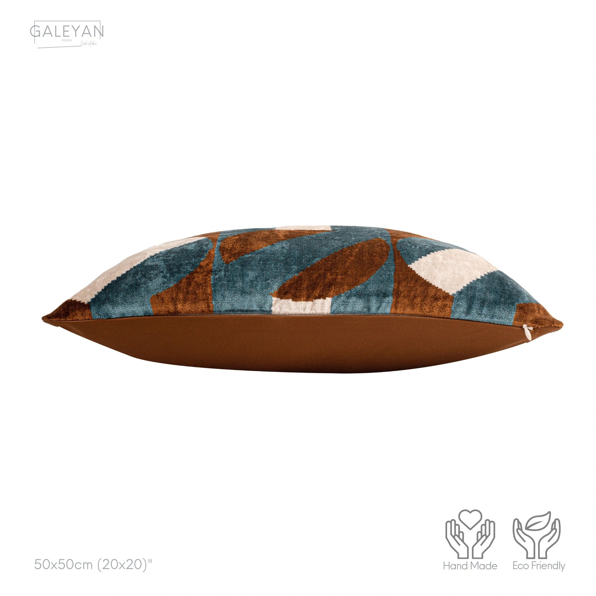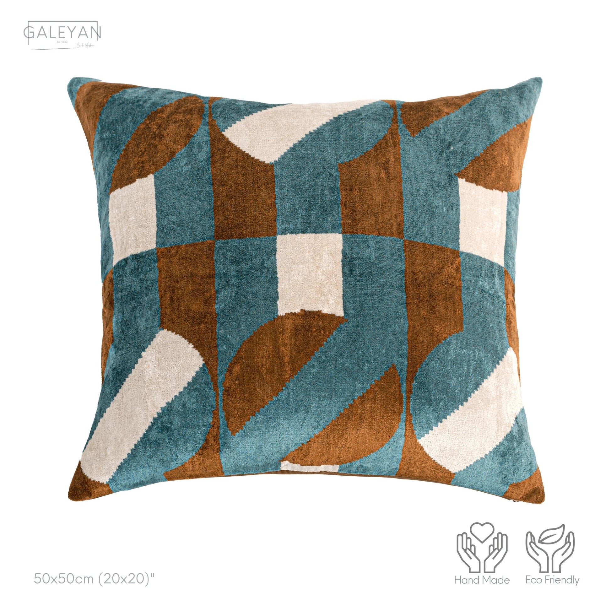 Luxury handmade ikat velvet pillow cover Brown & White & Turquoise Blue