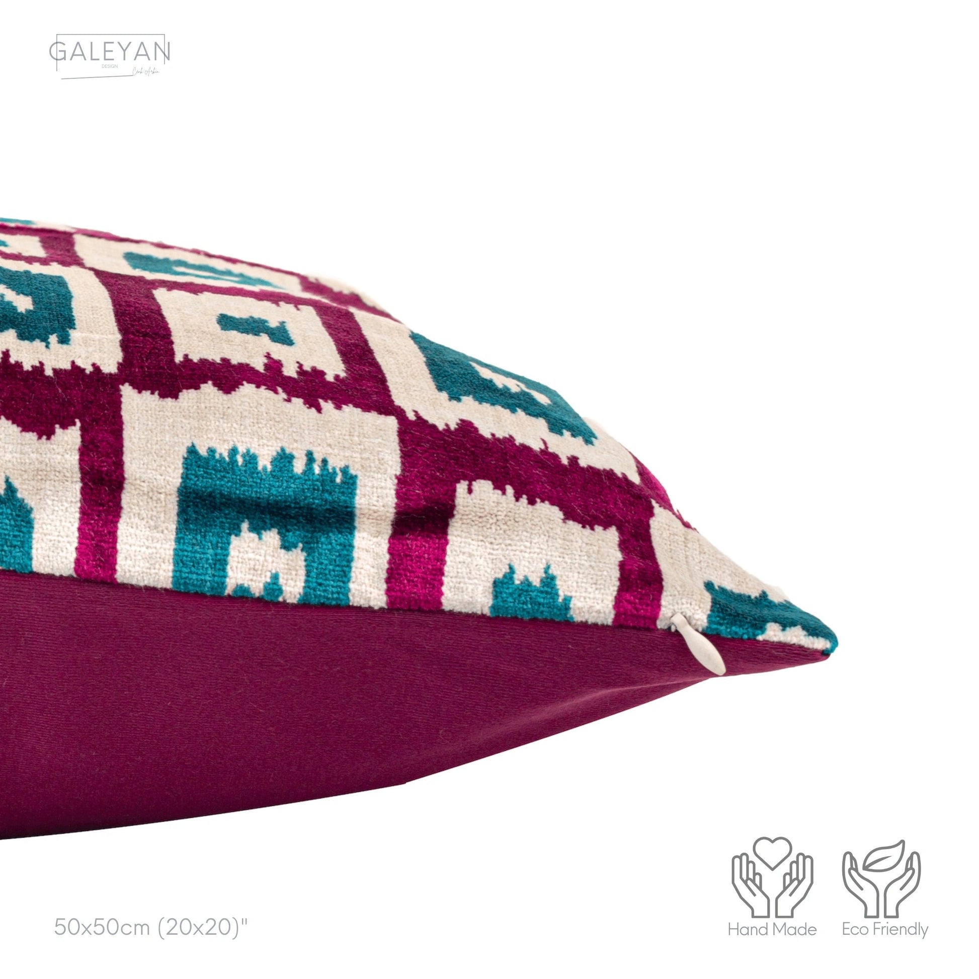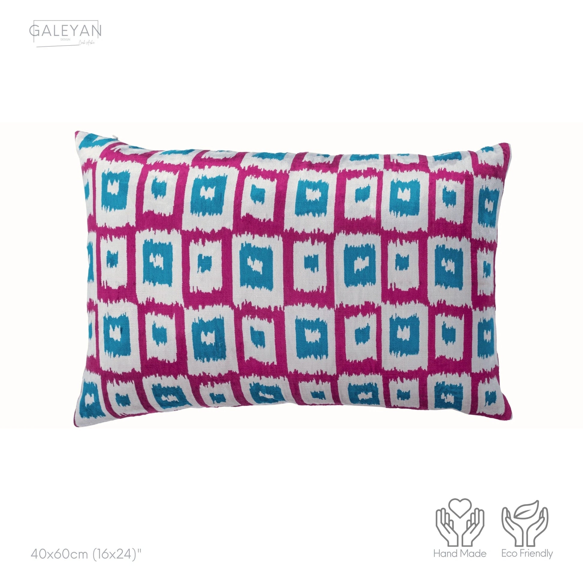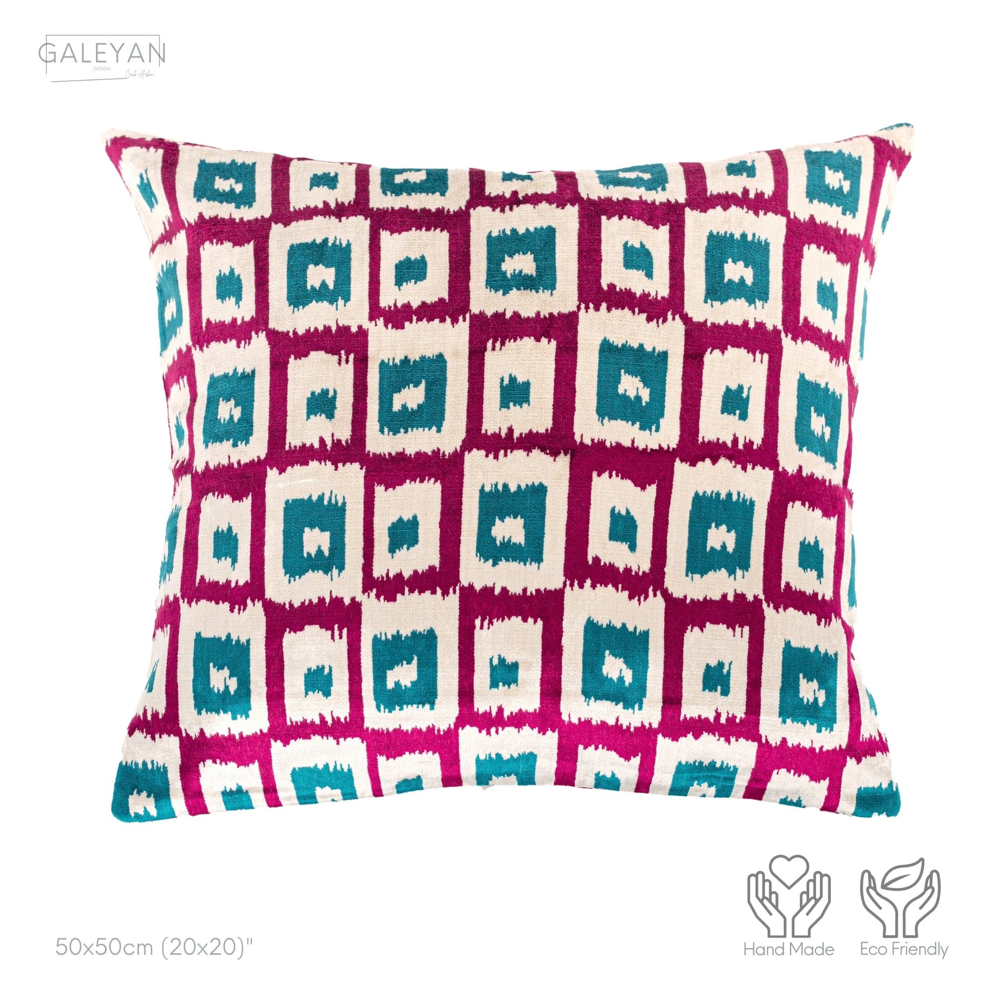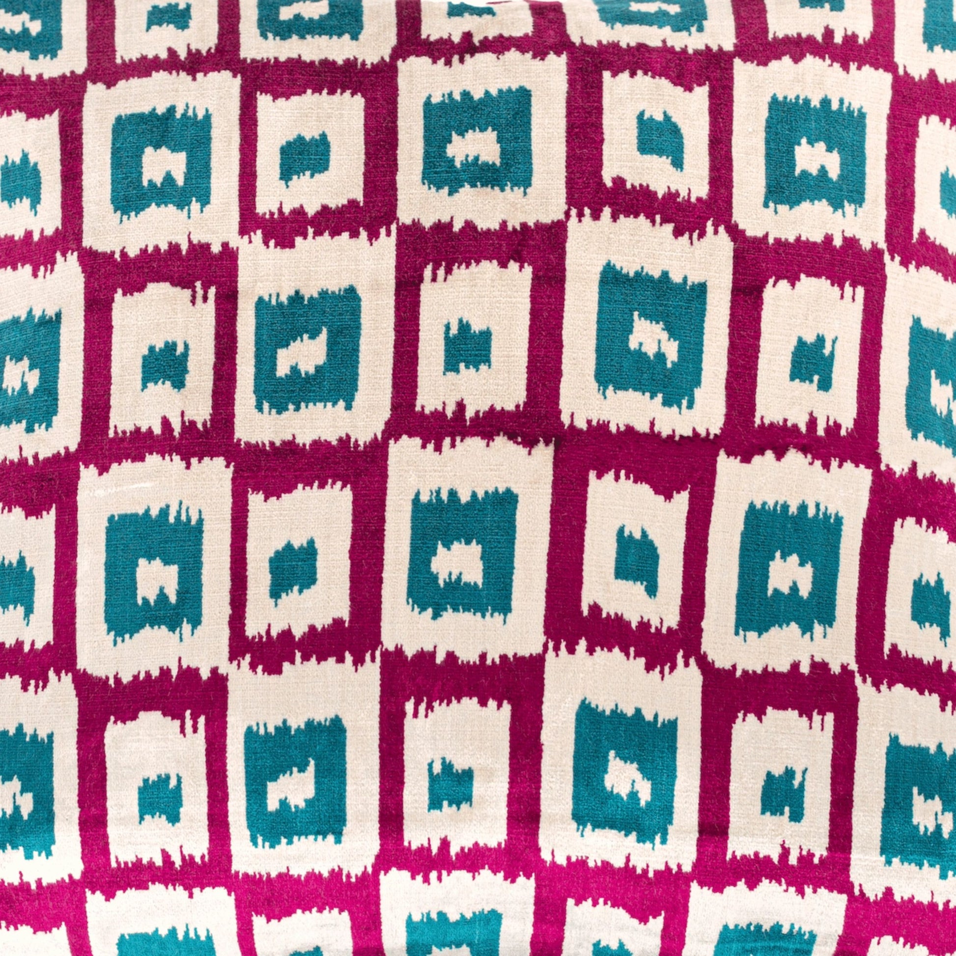 Luxury handmade ikat velvet pillow cover Fuchsia & Turquoise Blue & White